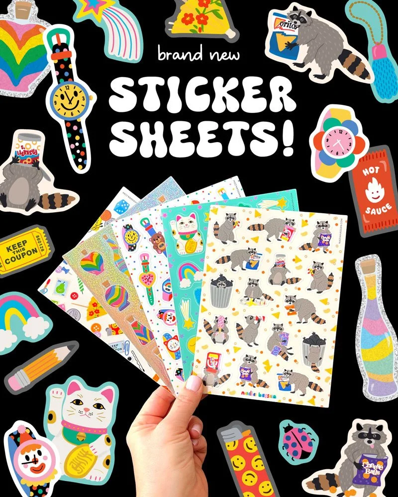 Five brand-new sticker sheets are here for all of your little treat needs, including my very first glitter stickers! I've got snackin' raccoons, the cutest watches ever, a tribute to an unsung household hero (the junk drawer, of course), lucky charms, and sparkly, soothing sand art.